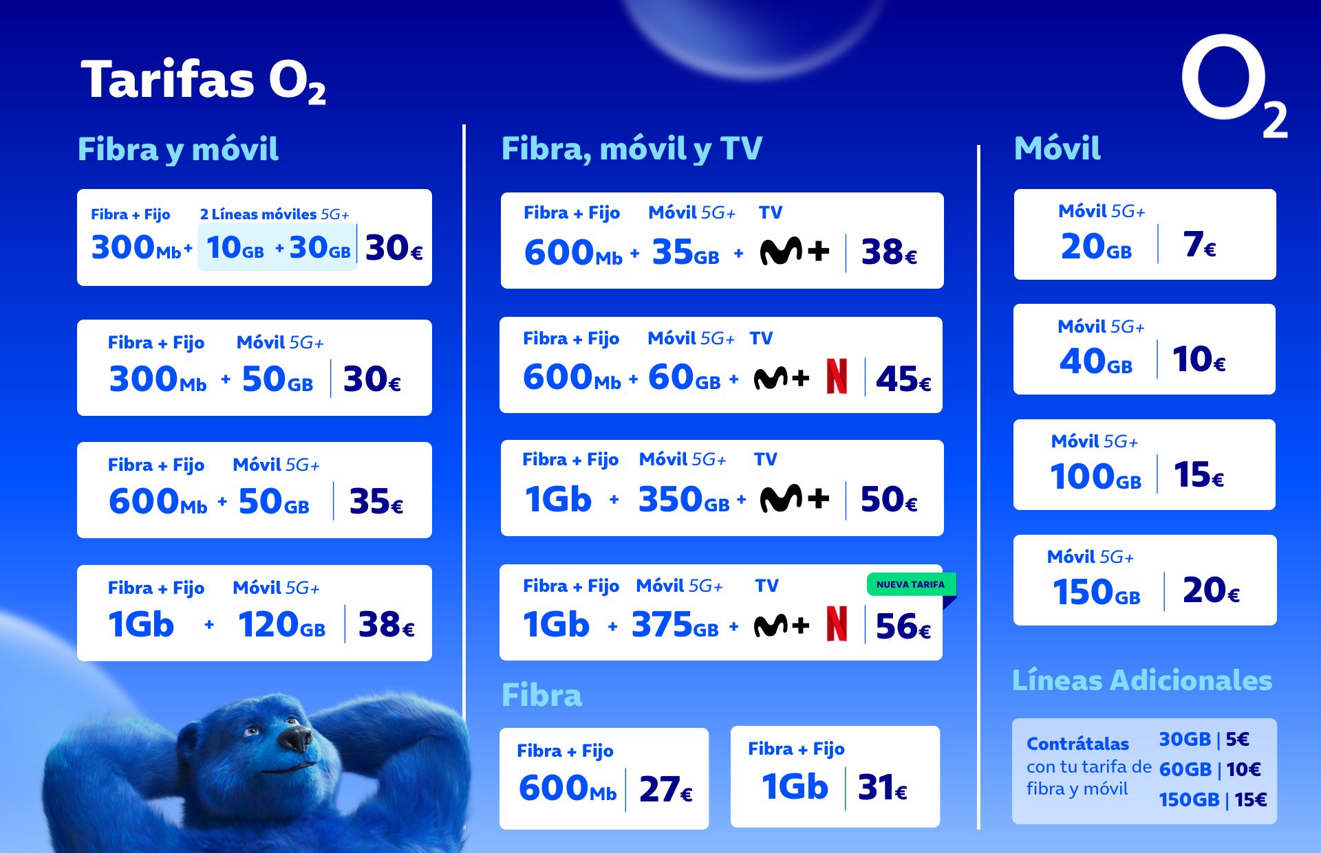 O2 vuelve a lanzar tarifas nuevas. Esta vez la tarifa de 30€ ahora trae 50GB. La nueva tarifa es Fibra 300MB+2 lineas movil con 30 y otra con 10GB por 30€.